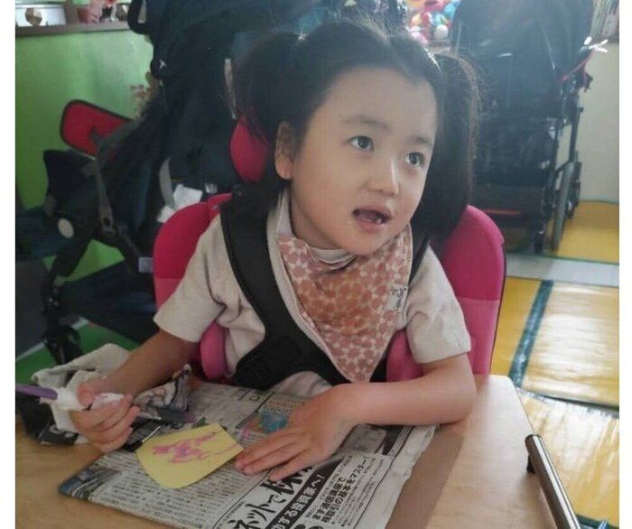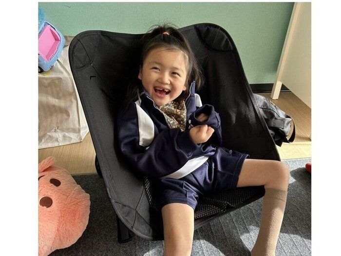 脊柱側弯(背骨の曲がり)も徐々に進行しています。背骨が曲がるため、体に合わせたサポーターや車いす(通称バギー)を制作し、日常的に使用しています。リハビリにも定期的に通っています。
