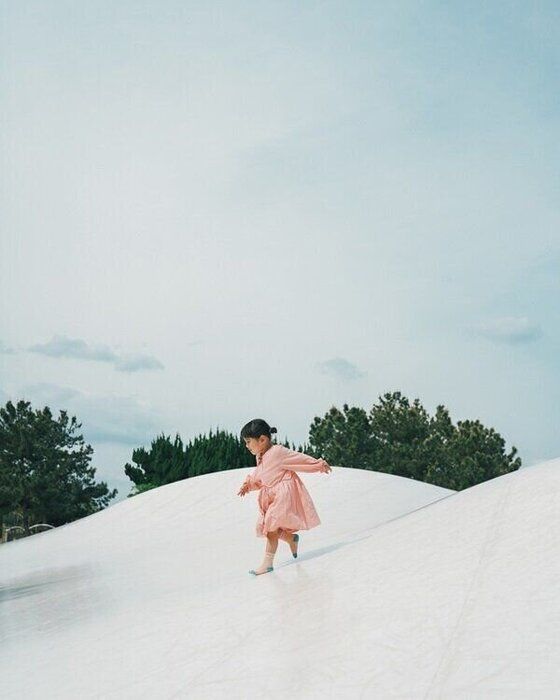 ふわふわドームの上を夢中で走り回る姿を撮影。スカートが軽やかにゆれる姿が、わが子の愛らしさを表現した一枚に。その日に行く公園の遊具の色を事前にチェックして、子どもが引き立つようなコーディネートを組んであげると素敵な写真が撮れます。