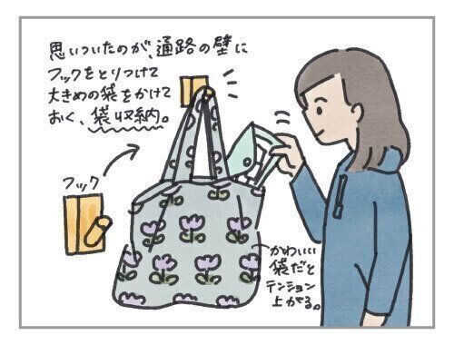 思いついたのが、通路(廊下)などの壁にフックを取り付け、大きめの袋をかけて収納として使うこと。保育園に持っていく袋や、子どもの外出用のセットや抱っこ紐などを収納するのに使い始めたら、これが、思いがけず便利・・・。お気に入りの柄の袋をかけることで、インテリアとしてもいい感じに。