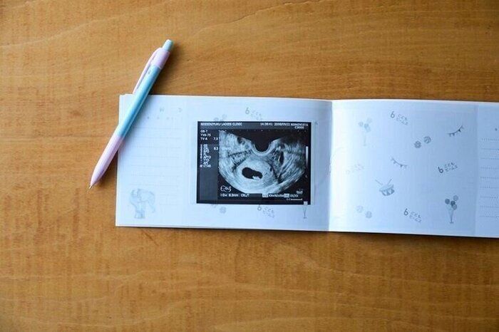中を開くと、エコー写真を傷や汚れから守るフィルムポケットが16ページも。メモスペースには、日付や妊娠週数、メッセージを残せます。産院に持っていって、待ち時間に記入するのもいいですね。