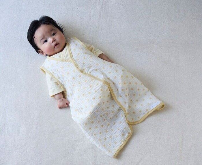 ふんわりやわらかい綿100%の生地を使用。しわ加工のダブルガーゼ素材で肌触りがよく、通気性もいいです。空気を含むので、オールシーズン赤ちゃんをやさしく包んでくれます。