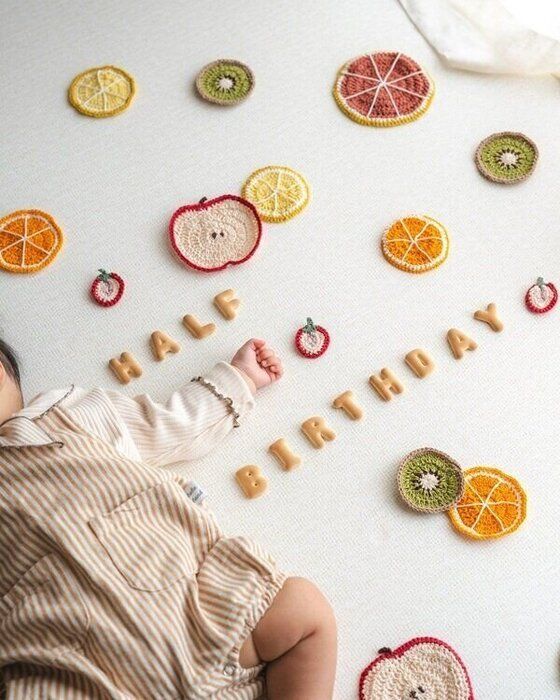 ハーフバースデーなので、ハーフフルーツの編み物を使って撮影。
