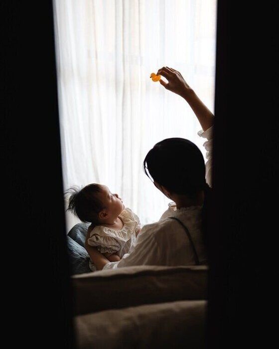 ママと遊んでいる瞬間を捉えた1枚。ドアを少し締めて、その隙間から撮影すると、ママと赤ちゃんを見守っているやさしい目線を表現できます。