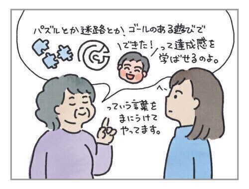 私の母親が昔、子どもの教育研究所に勤めていたらしいのですが、その母親が「パズルとか迷路とか、ゴールのある遊びで『できた!』って達成感を学ばせるのが大事なのよ。」と言っていたので、とりあえずそれを真に受けて、やってみています(笑)。効果のほどは・・・わかりませんが。
